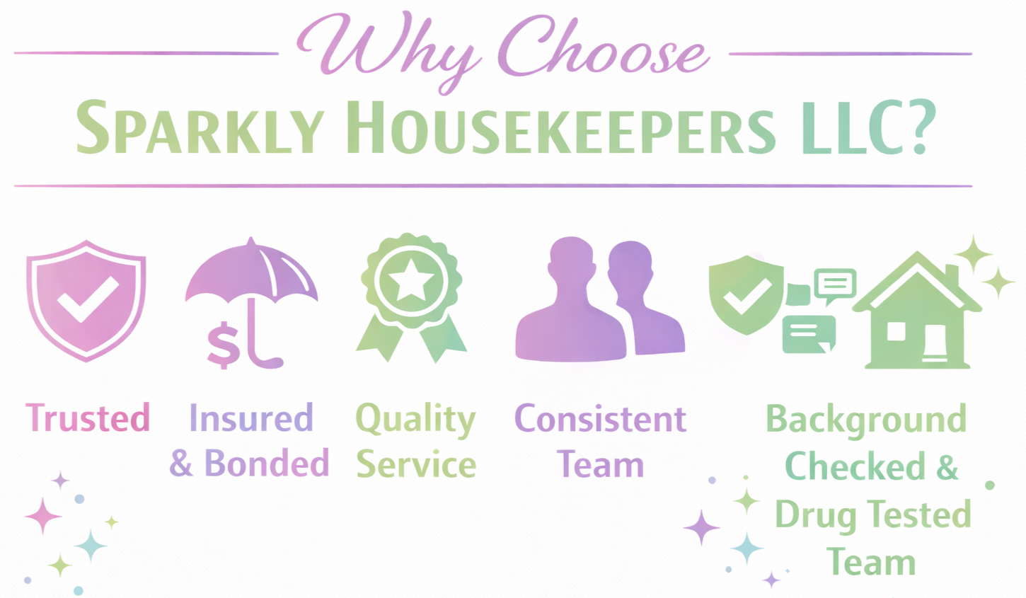 Getting started is simple. Reach out through our contact form or schedule a free in person walk through consultation by filling out our contact form, fill out our new client form for a free quote, call/text our office at 833-800-2709 or email us today at sparklyhousekeepers@gmail.com